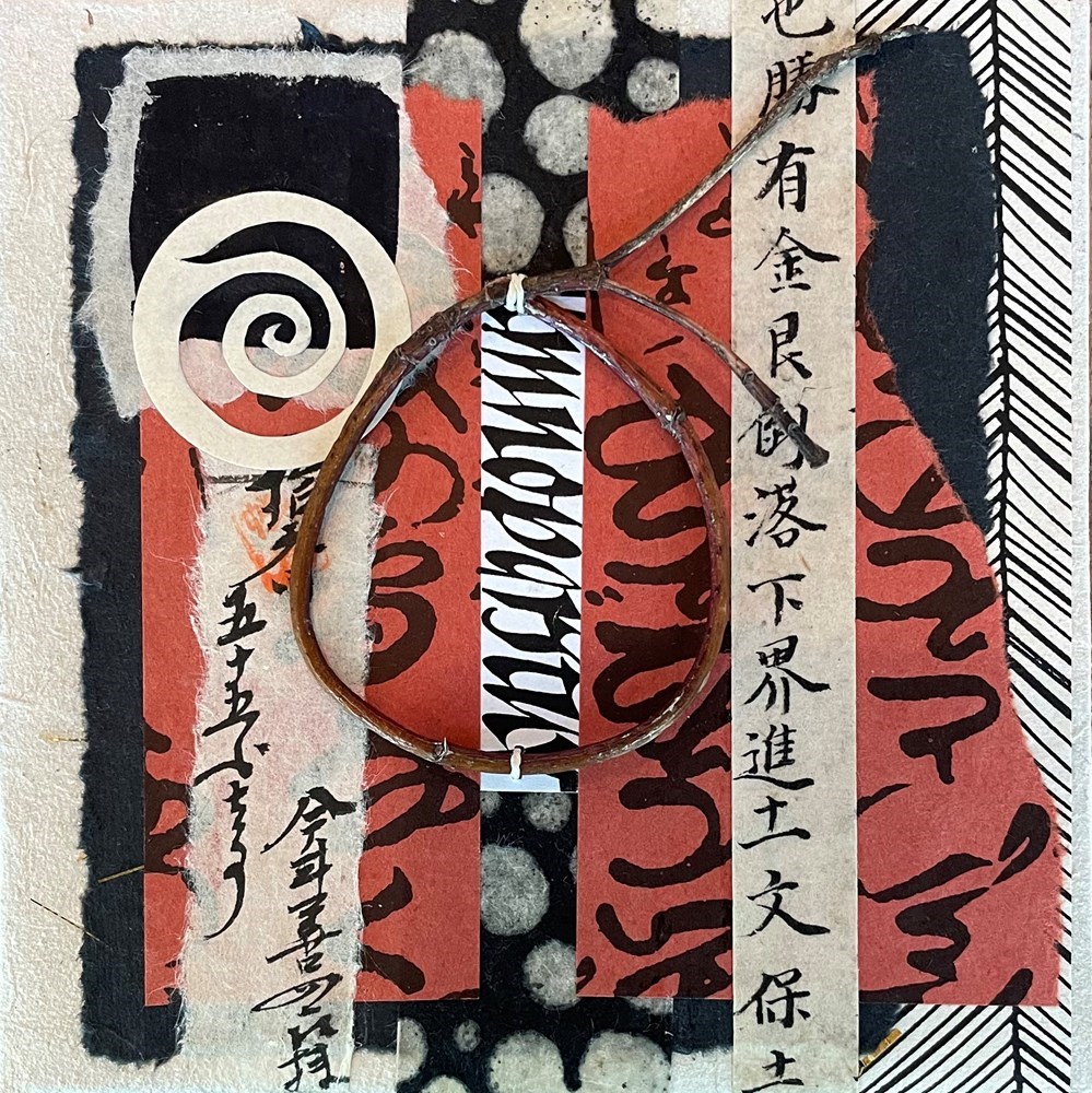 Collage of new and old snippets of calligraphy with circular wooden component.