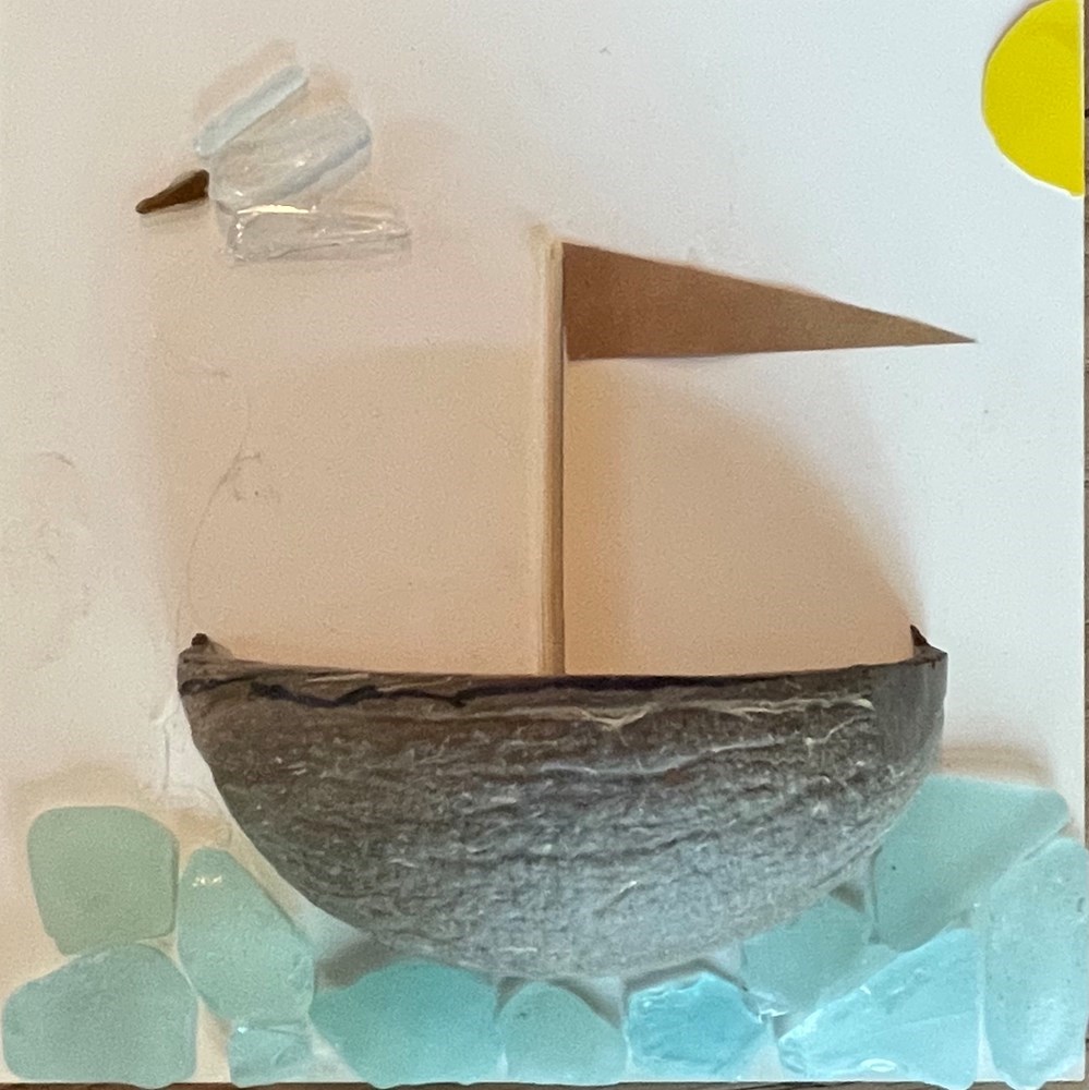 Set sail on a 3D coconut-ship! The seas are glass-blue, and a seagull leads the way.