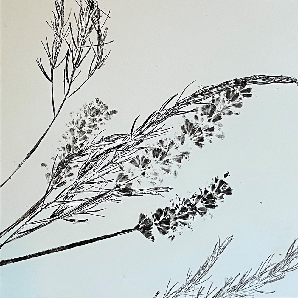 Ink on art tile, capturing the fine detail of grass and flowers.
