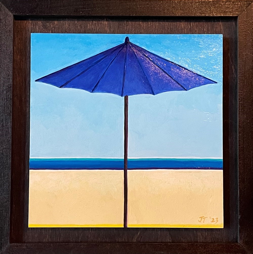 A blue umbrella set against a stylized beach landscape. Acrylic paint with gloss varnish.
