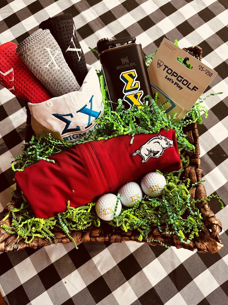 Enjoy a day at top golf or take it to the greens. This package includes 3 EX golf balls, 3 EX golf towels, EX hat, EX Stanley 16 oz. flask, TopGolf gift card ($50), and a Razorback quarter zip.