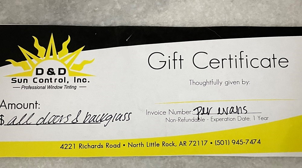 D&D Sun Control, North Little Rock, professional window tinting gift certificate for all door windows and back glass.