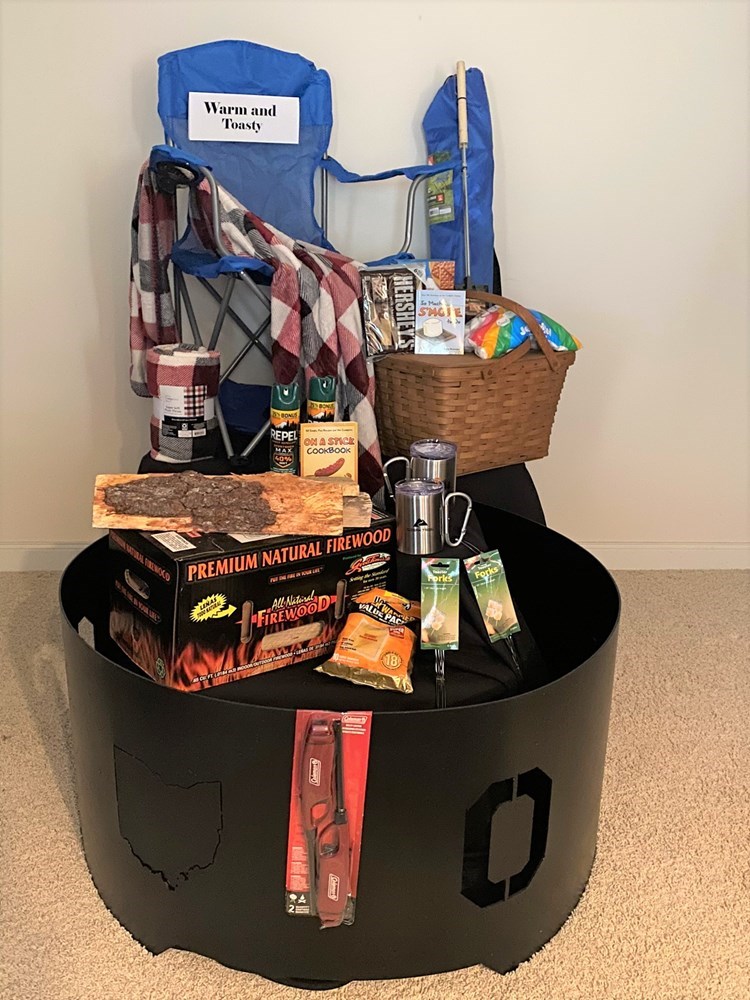 You're sure to stay warm and toasty, and cook up some yummy treats with this fabulous gift basket by the Kiwanis. Valued at $350, it includes: OSU Black Iron Fire Pit Ring 2 Blue Lawn Chairs with Storage/Carry Bags 2 Red, White & Black Plaid 50" x 60" Throw Blankets 1 Picnic Basket 1 Box of Natural Firewood 1 Package of Handwarmers 4 Hot Dog Forks 1 Pie Iron 2 Thermal Mugs with Lids & Hooks 2 Cans of Insect Repellent Chocolate Bars, Marshmallows & Graham Crackers for S'mores S'more Cookbook Hot Dog Cookbook 2 Long Neck Lighters