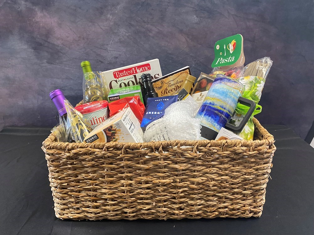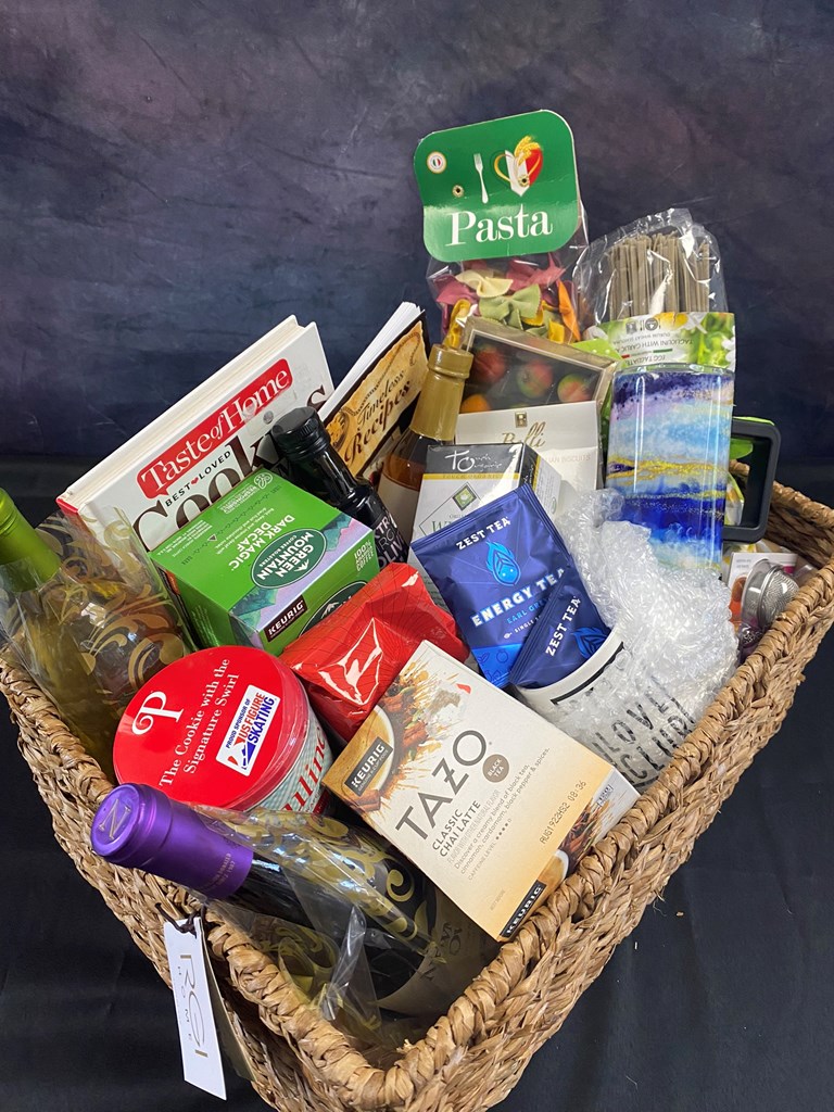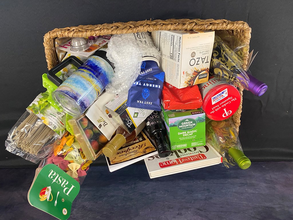 Our second basket from the Marietta Moose feature various drink, pasta and sweet items. Valued at $240 this basket is sure to satisfy your taste buds. This basket includes: Garlic & Basil Pasta Egg Pasta Five Color Pasta Roasted Garlic Infused Extra Virgin Olive Oil Pirouline Chocolate Hazelnut Cookies Orange-Chocolate Biscotti Biscuits 24 piece Marzipan Chocolates 20 oz Travel Mug Ceramic Coffee Mug Organic White Tea Bags Tazo Chai Latte Keurig Cups Energy Tea Bags Green Mountain Decaf Coffee Keurig Cups Seattle's Best Coffee, ground Salted Caramel Skinny Syrup Moose Timeless Recipes Cookbook Taste of Home Best Loved Cookies Cookbook Bottle of Marietta Wine ~ Autumn Mist Bottle of Newman's Own Wine ~ Pinot Noir Large Woven Basket