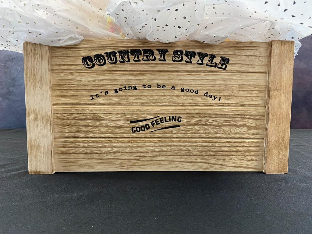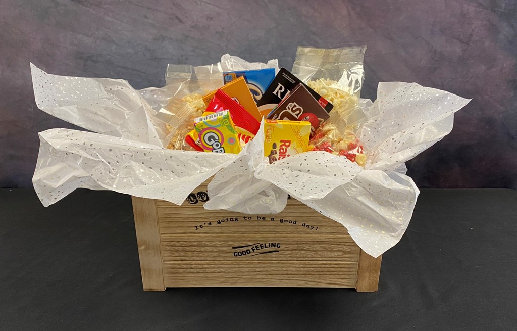 This basket brings the smiles ~ It's all about movies and munchies! This great basket includes: $30 Regal Cinemas Gift Card 4 flavors of popcorn Box of Goobers Box of M&Ms Bos of Milk Duds Box of Raisinets Bos of Gobstoppers Bag of Starburst Gummies Wood Crate with text